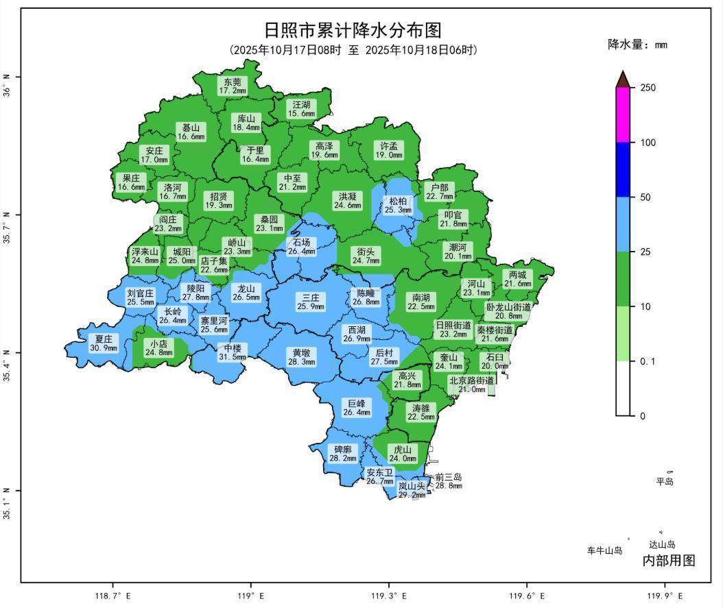 各区县平均降水量如下:东港区24.4毫米,岚山区27.2毫米,莒县22.3毫米,五莲县21.9毫米,经济技术开发区22.6毫米,山海天旅游度假区21.3毫米,高新技术产业开发区23.2毫米。
