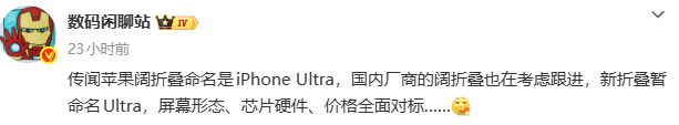 起初 iPhone 折叠屏的命名,还是 iPhone Fold,但不知是果子看到国产机都有 Ultra 后灵机一动,亦或是对自家折叠屏足够有自信。